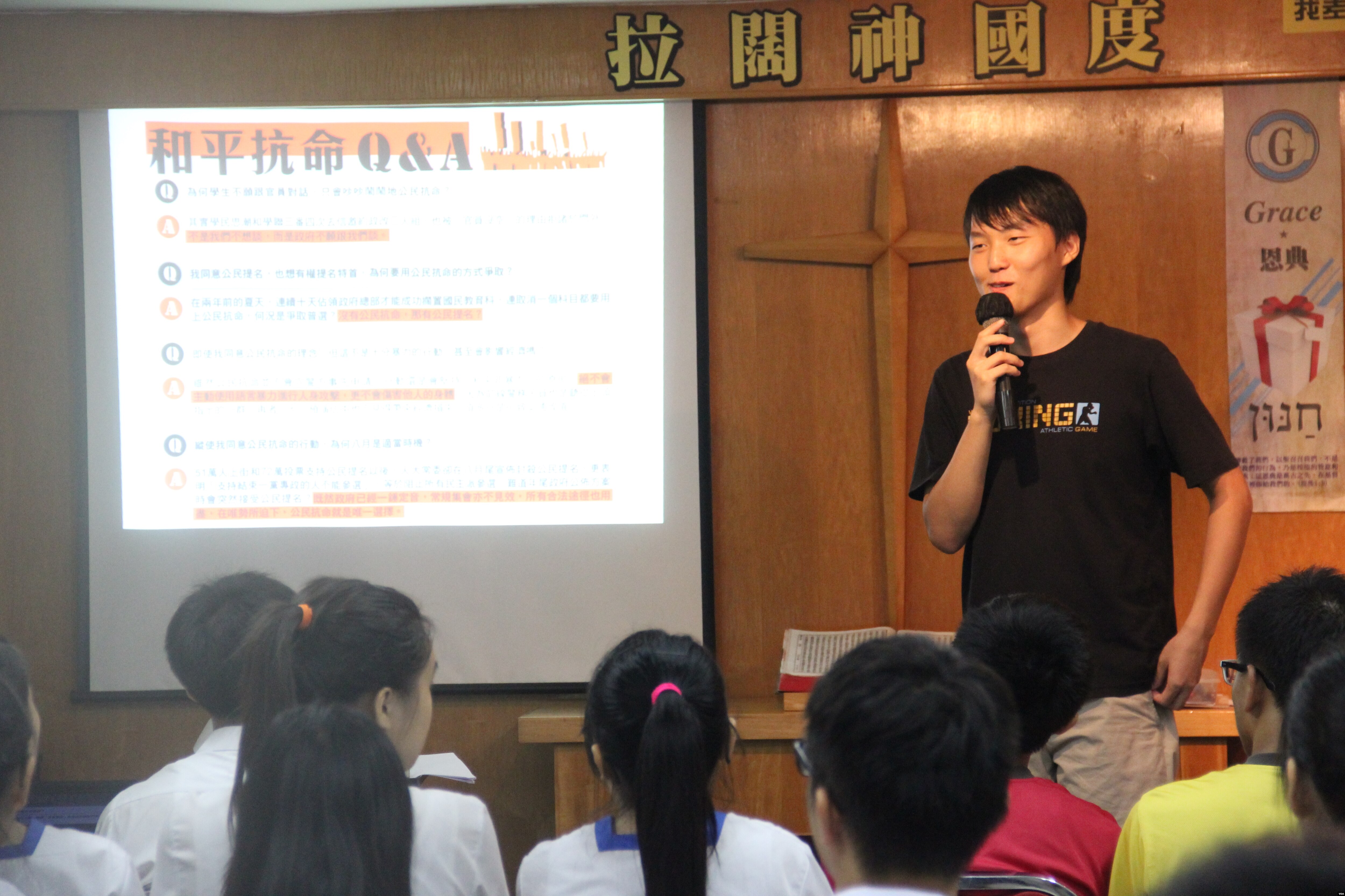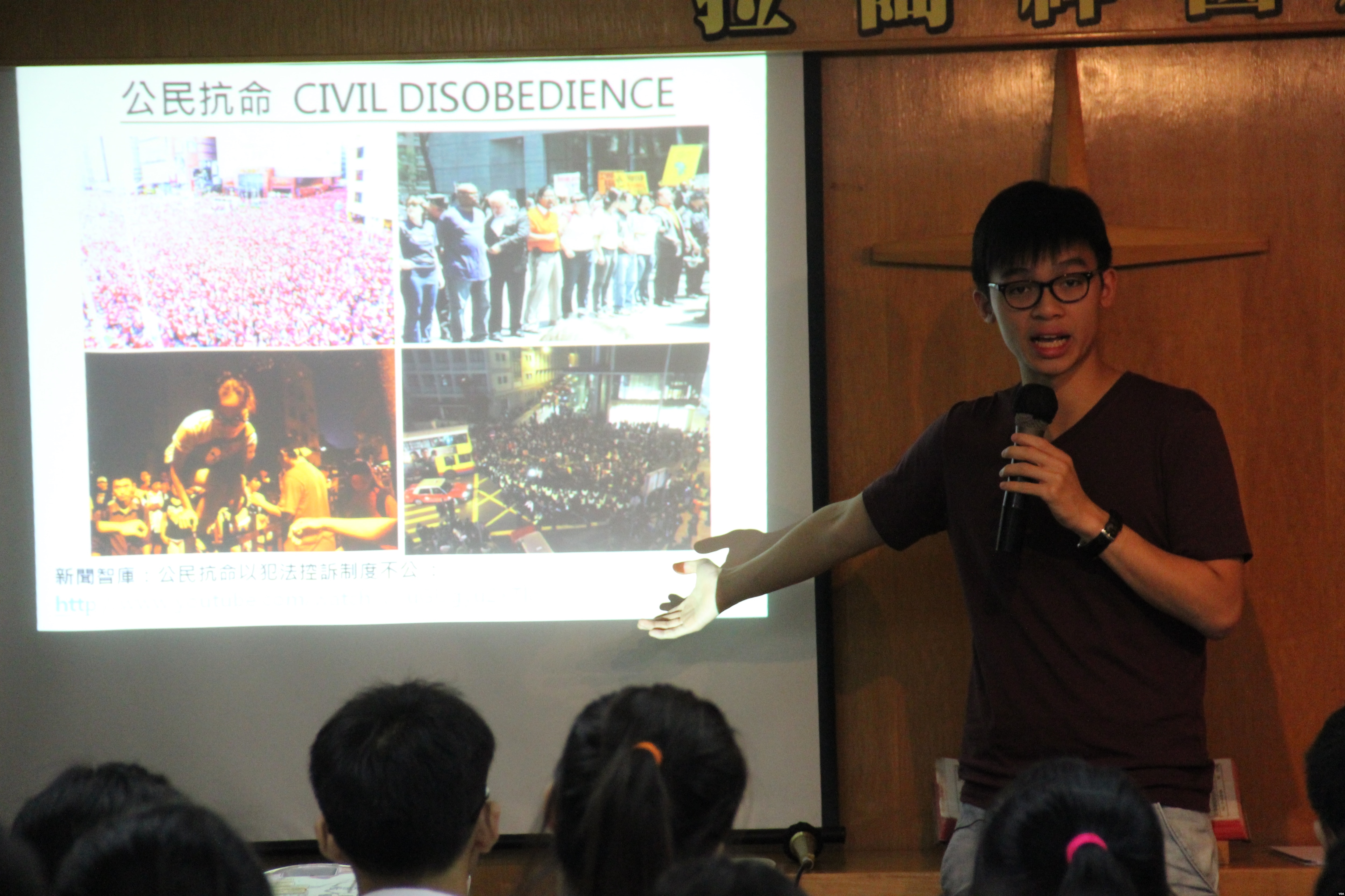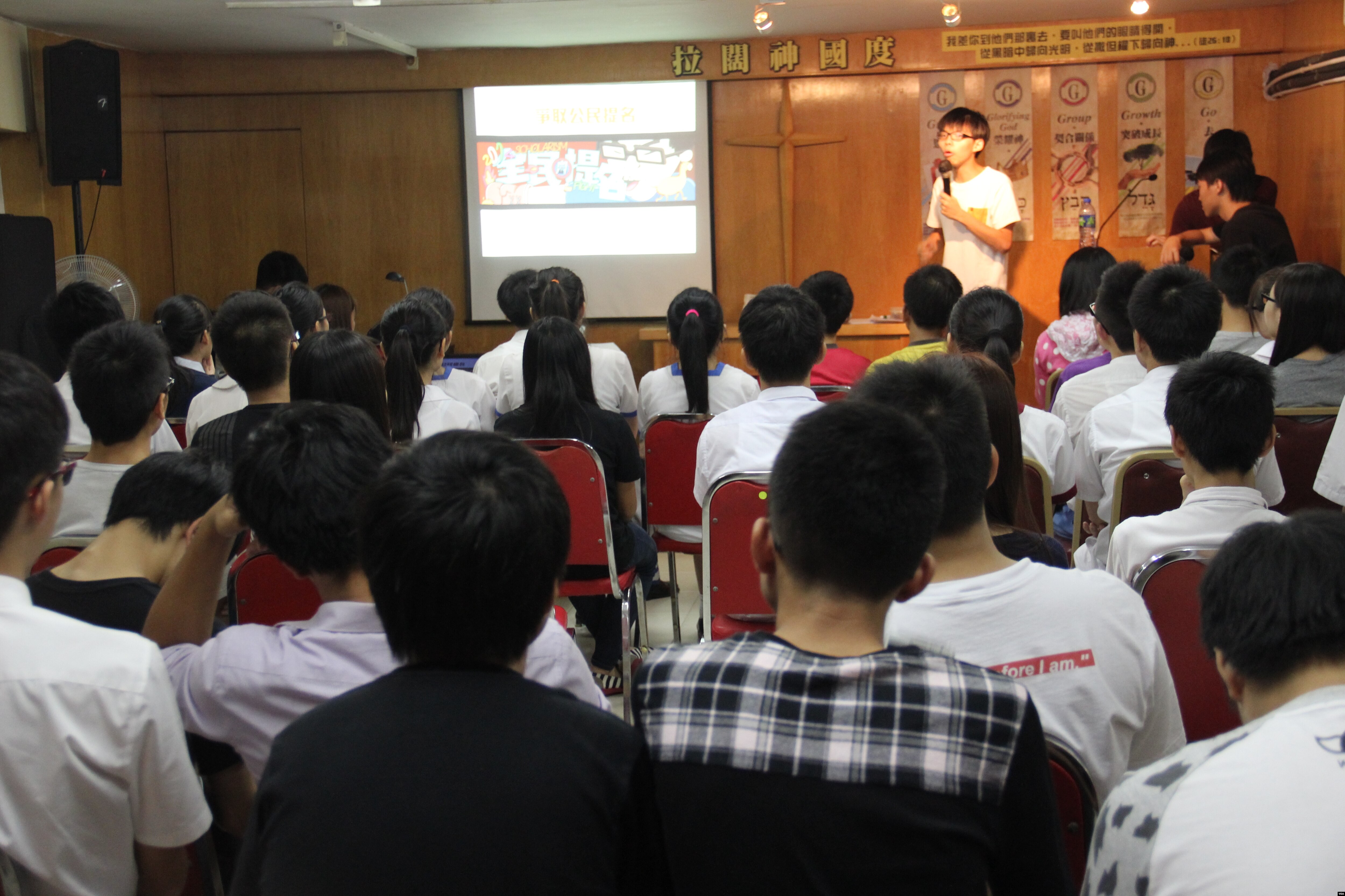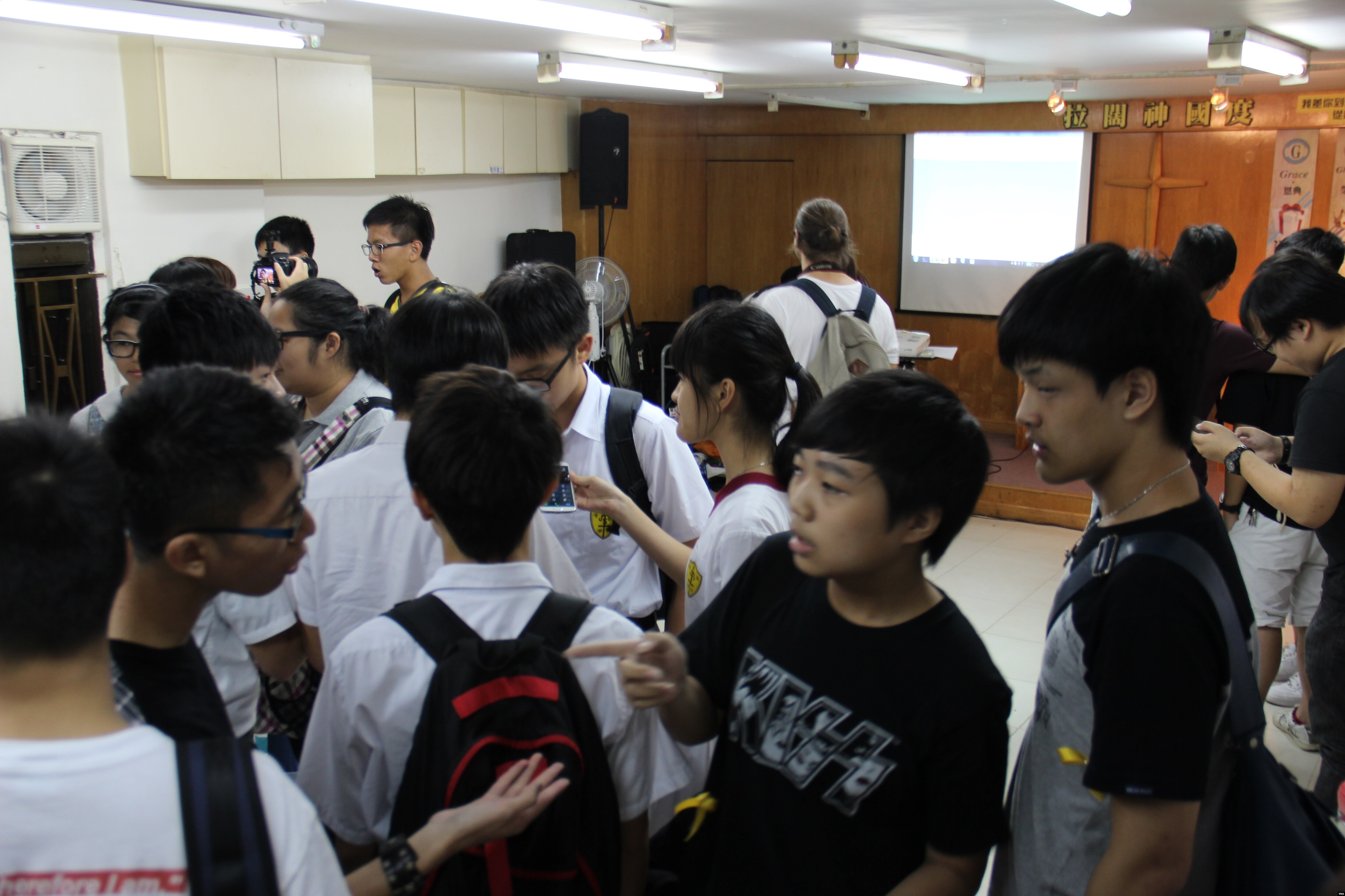 9月3日下午,学民思潮在九龙沙田的一所教堂举办三场“公民教室”的首场活动,由今年刚升入大学的数位学民骨干,包括召集人黄之锋、黎汶洛、刘贰龙等,向刚刚下学的40多位中学生讲解政改和公民抗命。