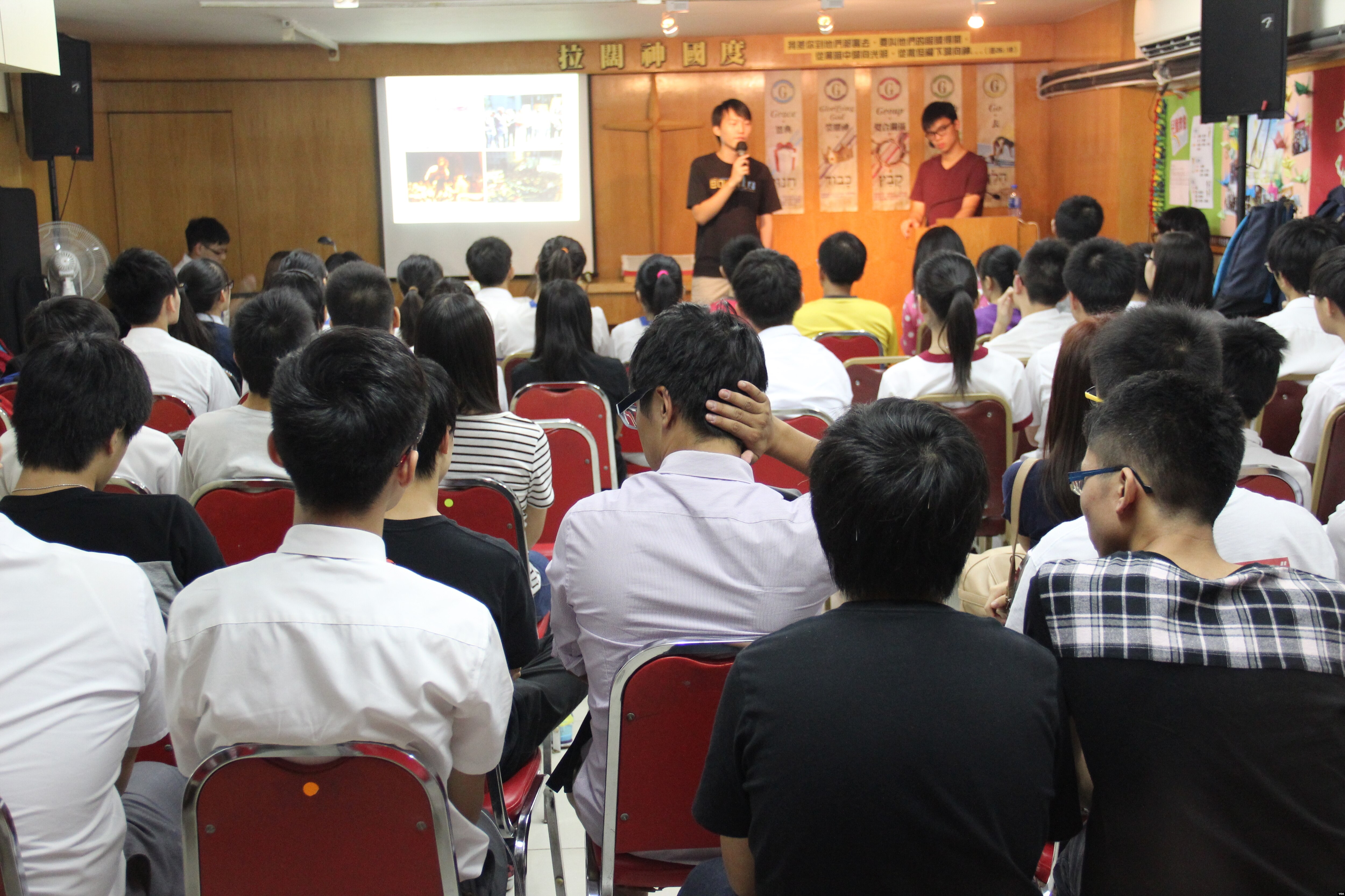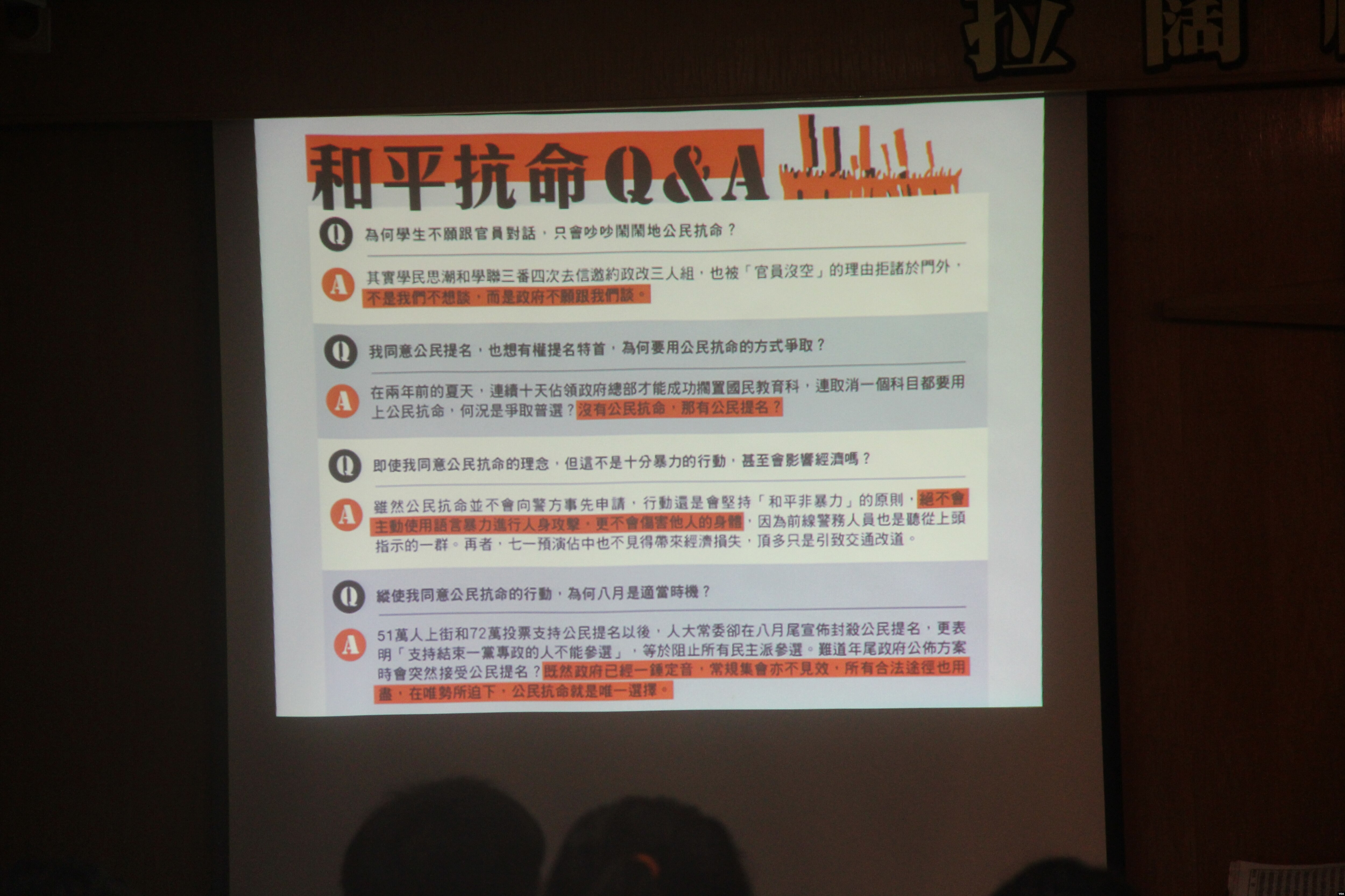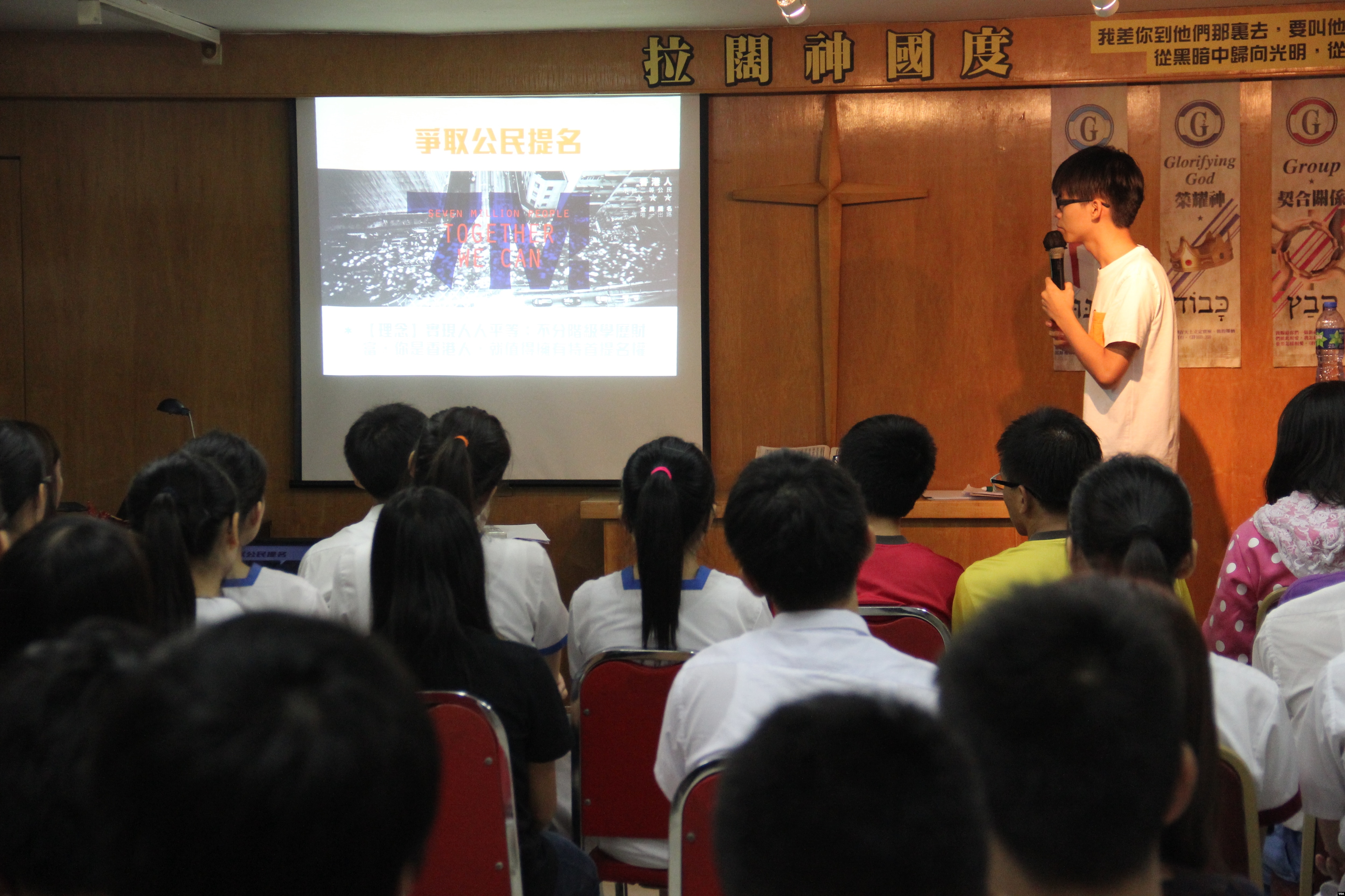 9月3日下午,学民思潮在九龙沙田的一所教堂举办三场“公民教室”的首场活动,由今年刚升入大学的数位学民骨干,包括召集人黄之锋、黎汶洛、刘贰龙等,向刚刚下学的40多位中学生讲解政改和公民抗命。