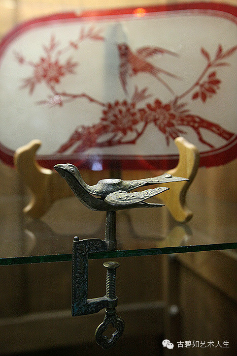 凤形台夹,凤凰的嘴巴可以张开衔着编制的布料,下部旋钮固定于桌子上,虽然只是一个铜制小配件,但是足以看到民国时期大家非常注重生活情趣,可以把一件枯燥的工作变得很优雅。
